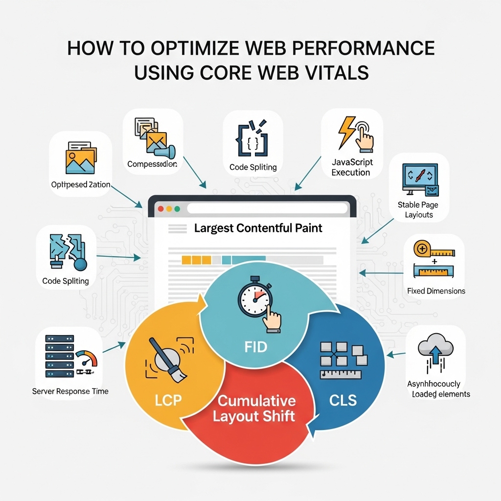 Core Web Vitals focus on loading (LCP), interactivity (FID), and stability (CLS). To optimize, compress images, lazy-load, minify code, use CDN caching, and eliminate render-blocking scripts.