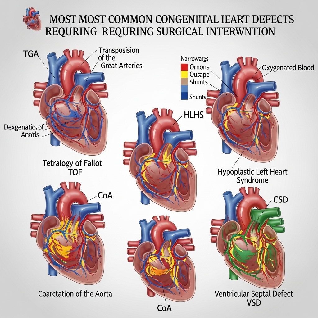 There are many different types of congenital heart defects, ranging from simple to complex. Some of the most common congenital heart defects that require surgical intervention in newborns include: