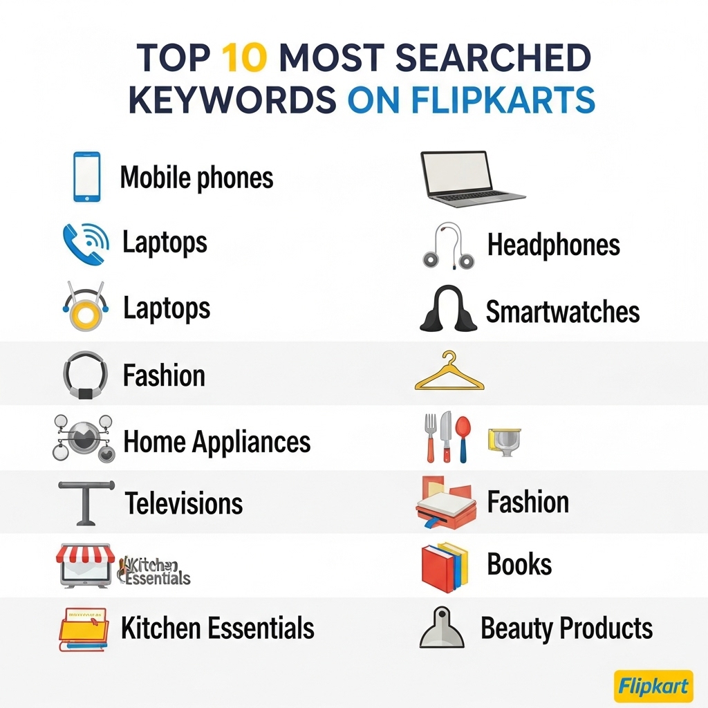 Smartphones: Keywords like "iPhone," "Samsung," "OnePlus," and "Xiaomi" are highly searched on Flipkart.