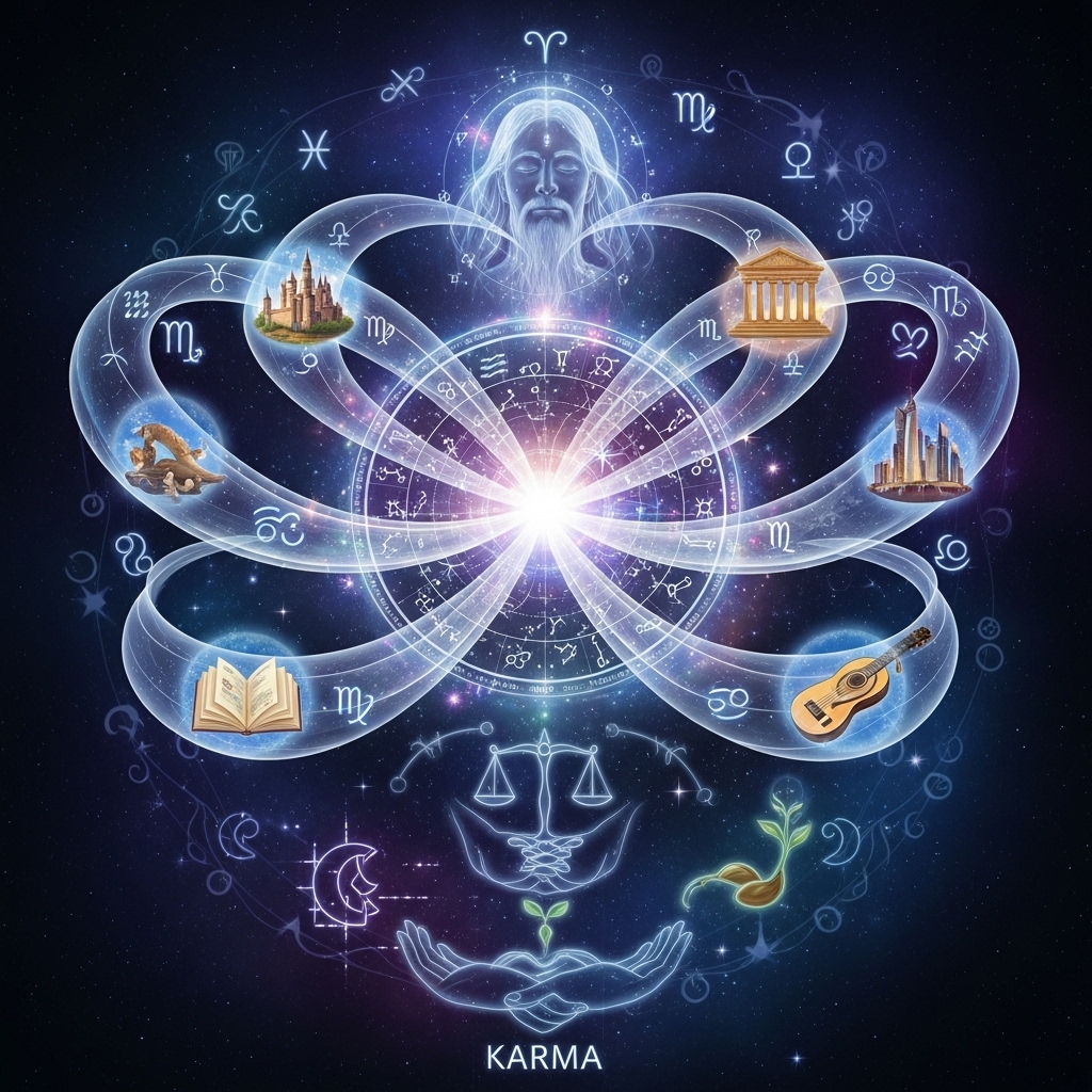 Karma refers to the law of cause and effect operating across lifetimes. Astrology provides symbolic insight into karmic patterns shaping present circumstances.