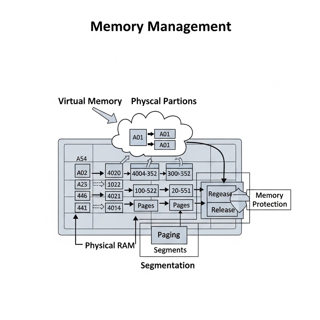 Memory management ensures that each process receives isolated and protected memory. Modern OSes use virtual memory and paging. Pages are mapped to physical frames, allowing processes to exceed physical RAM through swapping. Memory allocation strategies include first-fit, best-fit, and buddy allocation. The OS prevents memory corruption through protection bits and address translation via the MMU.