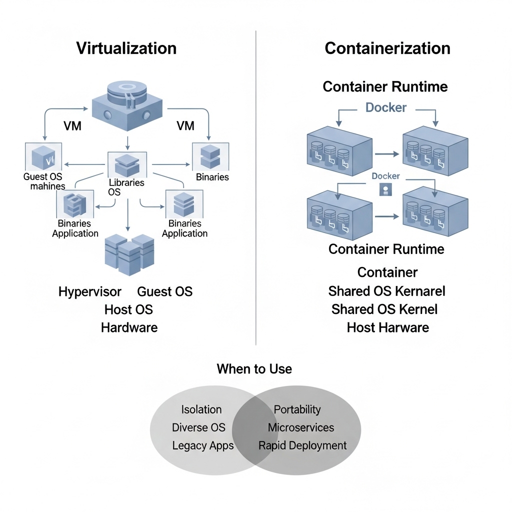 Containerization, on the other hand, uses OS-level virtualization. Tools like Docker and Podman package applications along with dependencies but share the host OS kernel. Containers are lightweight, fast to start, and ideal for microservices, cloud-native applications, and CI/CD pipelines.