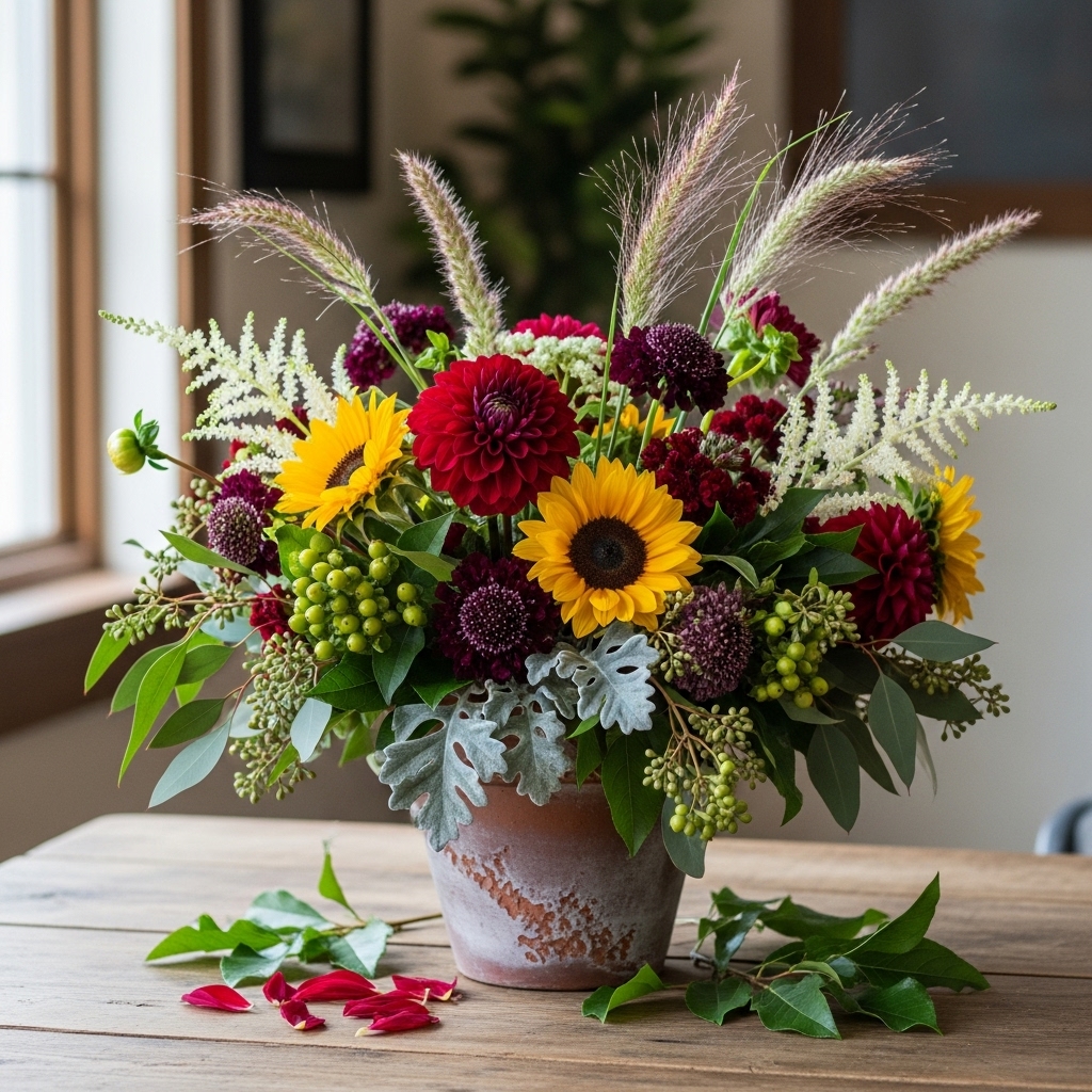 When designing an arrangement, start by selecting a base of foliage or greenery that complements the seasonal blooms you've chosen. This could be anything from ferns and lemon leaves in spring to branches of oak or maple in autumn. Next, add your main flowers, considering their color, texture, and size in relation to the base and the overall design principles. Finally, embellish with secondary elements like berries, seeds, or decorative items that enhance the seasonal theme and texture. For example, a winter arrangement might feature evergreen branches, white roses, and pinecones, while a summer arrangement could include sunflowers, daisies, and a ribbon made from natural fibers.