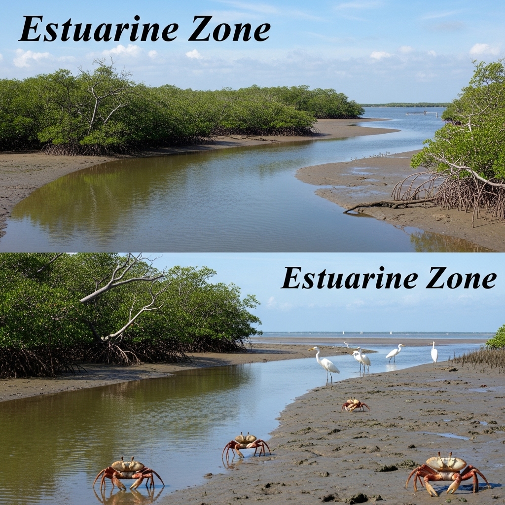 Estuarine and coastal ecosystems are found in the areas where freshwater rivers and streams meet the ocean. These ecosystems are characterized by a mix of fresh and saltwater, and are home to a diverse range of plants and animals. Estuaries, such as bays, deltas, and mangrove swamps, provide important habitat for many marine species, including fish, shellfish, and birds. For example, the Chesapeake Bay in the United States is an important estuarine ecosystem, providing habitat for species such as the blue crab and the oyster, and supporting commercial fisheries and tourism.