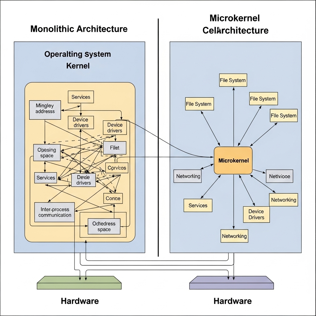 Microkernel architectures have several advantages, including modularity, flexibility, and scalability. They are easier to maintain and modify, as individual components can be changed or replaced without affecting the entire system. Microkernel architectures are also more secure, as the kernel and device drivers are isolated from each other, reducing the risk of errors or security breaches. However, microkernel architectures have some disadvantages, including increased complexity and overhead. The communication between components can be slower, as it requires passing messages through the microkernel, which can result in increased latency. For instance, the Symbian operating system, which uses a microkernel architecture, can be more complex to implement and manage, due to the separate components and interfaces.