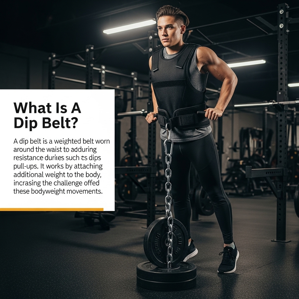 A dip belt is a wide leather or nylon belt with a chain or strap attachment that allows you to add weights to your dips. The belt is worn around the waist, and the chain or strap is attached to a weight plate or dumbbell, which is then lifted as you perform the dip exercise. Dip belts are designed to be comfortable and secure, with padding and adjustable straps to ensure a snug fit. They are available in various sizes and materials, including leather, nylon, and chain belts.
