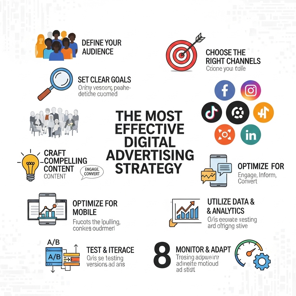 In conclusion, the most effective digital advertising strategy will depend on your business goals and target audience. By understanding your target audience, and using a combination of digital advertising strategies such as SEO, PPC, social media advertising, influencer marketing, and content marketing, you can increase brand awareness, drive traffic and sales, and establish your brand as a thought leader in your industry. Remember to measure and optimize your digital advertising strategy regularly, and make data-driven decisions to increase its effectiveness. With the right digital advertising strategy, you can reach and engage with your target audience, and drive business results.
