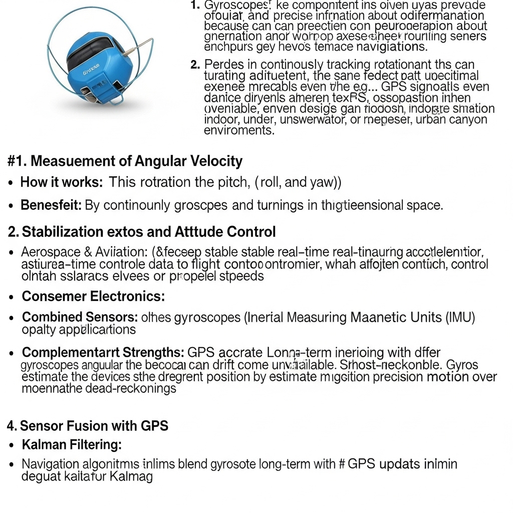 Gyroscopes enhance navigation systems in several ways. Firstly, they provide high-accuracy data about an object's orientation and rotation, allowing for more precise calculations of its position and velocity. Secondly, gyroscopes can operate in environments where other navigation systems, such as GPS, are unavailable or unreliable. For example, in tunnels or underwater, gyroscopes can provide accurate navigation data even when GPS signals are blocked. Thirdly, gyroscopes can be used to improve the stability and control of vehicles, such as aircraft and drones, by providing real-time data about their orientation and movement.