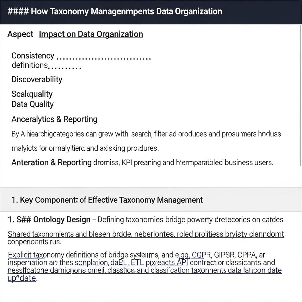 Effective taxonomy management requires careful planning, maintenance, and governance. Some best practices for taxonomy management include establishing clear goals and objectives, involving stakeholders in the taxonomy development process, and using standardized terminology and classification systems. It is also important to regularly review and update the taxonomy to ensure it remains relevant and effective. Additionally, taxonomies should be designed to be flexible and adaptable, allowing for changes and updates over time. For instance, a company like Google uses a taxonomy to categorize its search results, and regularly updates its taxonomy to reflect changes in user behavior and search trends.